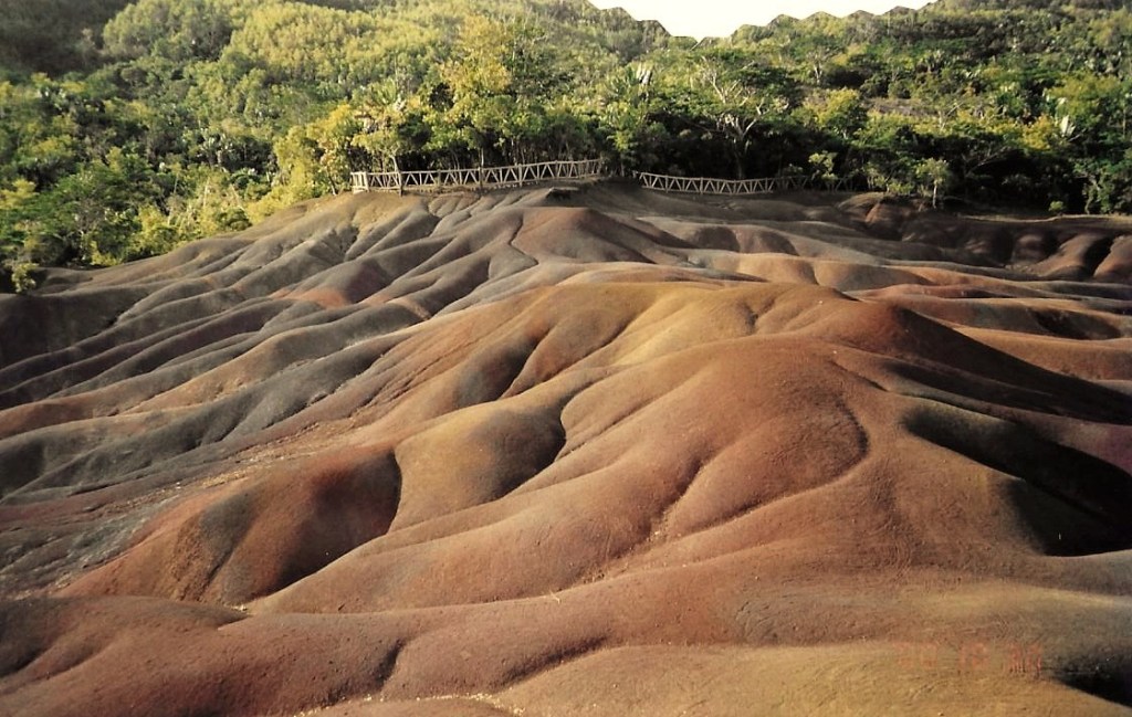Last stop of the day was at Chamarel where we followed pathways among the Colored Earths, reminiscent of Arizona’s Painted Desert. The undulating layers of red, yellow,blue, and brown cast a subtle magic over the area. A nearby waterfall emerged amidst the moors and primeval vegetation. As the sun slowly sank, colors of the earth melted into purplish hues. A perfect ending to an amazing day in this little-known country afloat in the middle of the Indian Ocean.