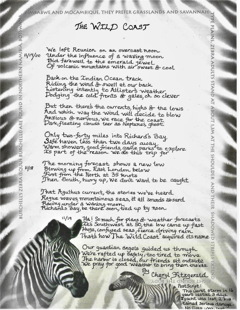 There’s so much more to South Africa than its magnificent wildlife. We soon discovered it’s a country of contrasts and diverse beauty. Sailing from Richard’s Bay we negotiated the swift SW Agulhas current and quick-changing weather windows, seeking sheltered harbors which are few and far between. After a too-long stop in crime-ridden Durban, we moved on to Port Elizabeth and celebrated Christmas with a few cruising friends.